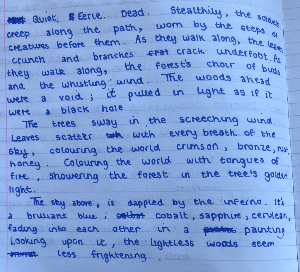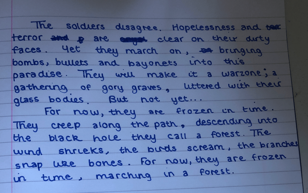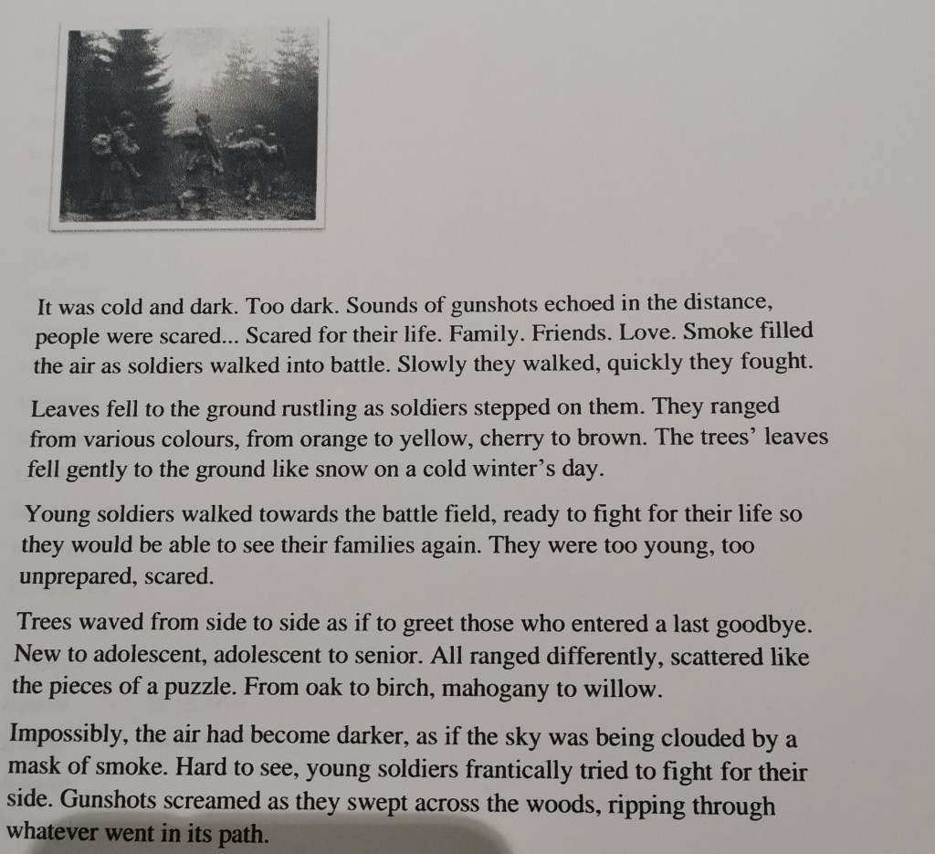 My haversack is a heavy weight on my back, I need to move, why should I be able to sleep anyway? I saw rats gnawing on those men who will never go home again, never to see their family- instead just a piece of paper will make it home, a paper that tells them of his death- why should I have the privilege of sleep when others cannot. I leave my haversack and run on through the trench, ducking shells and shrapnel as I go. Machine guns rattle in my ears, drowning out the devilish screams of dying men and the desperate Bugles, sounding their trumpets.